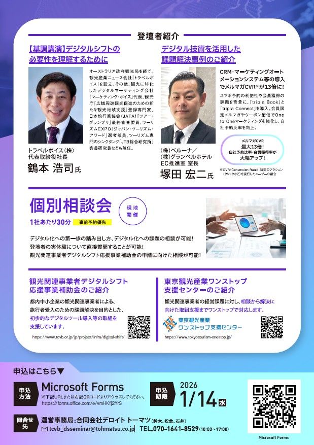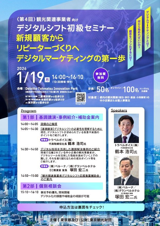 도쿄도와 (공재)도쿄관광재단은 관광 관련 사업자를 대상으로 디지털 도구 등을 활용한 업무 디지털화(디지털 시프트)를 지원하기 위해 연 4회 세미나를 개최하고 있습니다.