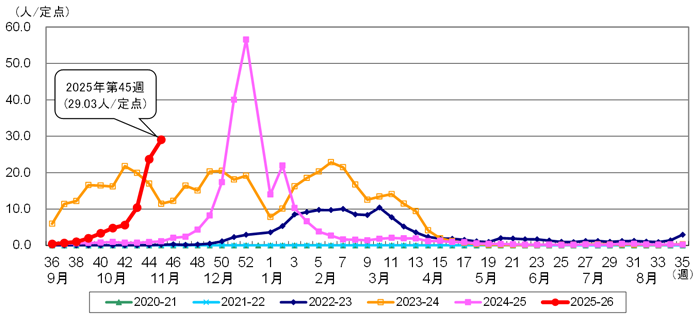11월 3일부터 11월 9일(제45주)의 정점 의료기관에서의 환자 보고 수는 29.03명이었습니다. 보건소별 환자 보고 수가 경보 레벨에 있는 곳은 31개 보건소 중 12개 보건소이며, 해당 보건소 관내 인구 비율은 도 전체의 46.18%에 이르러 경보 기준을 넘고 있습니다. 2025년 9월 1일 이후, 도내의 학교와 사회복지시설 등에서 발생한 인플루엔자 유사 질환의 집단감염 사례는 11월 9일까지 1,616건 보고되었습니다.