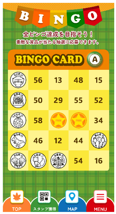 스마트폰이나 가이드북의 빙고 카드를 보며 도내의 안테나숍을 돌아다니며, 각 매장에 비치된 스탬프를 찍어 빙고를 완성하세요.