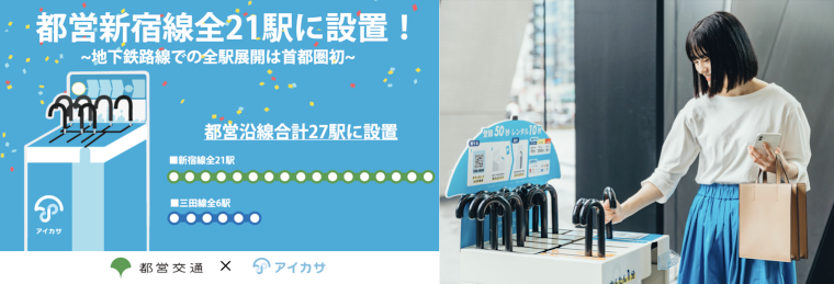 ➞ 도에이신주쿠선 전역에 우산 쉐어링 서비스 '아이카사'의 렌탈 장소를 장마철에 맞춰 설치 확대합니다! ~지하철 노선 전 역 전개는 수도권 최초! ~ (PDF:1MB)