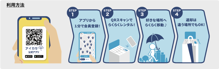 「아이카사」는, "비오는 날을 쾌적하게 해피하게"와 "일회용 우산을 제로로"를 미션으로 2018년 12월에 서비스를 개시한 일본 최초의 본격적인 우산의 쉐어링 서비스입니다.돌발적인 비에도 비닐 우산을 그때마다 구입하지 않고, 역이나 거리에서 튼튼하고 서스테이너블한 「아이카사」를 빌리고, 비가 그쳤을 때는 가까운 우산 스폿에 우산을 반납하는 것으로 에코에 공헌하면서(※), 빈손으로 편리하게 이동할 수 있는 것이 특징입니다.현재는, 앱 등록자수 50만명을 넘어, 도쿄역이나 신주쿠역을 시작으로 한 도내 전역과 관동, 간사이, 아이치, 오카야마, 후쿠오카, 사가 등 12 도도부현에서 전개해, 스팟수 1350개소 이상에 설치하고 있습니다.