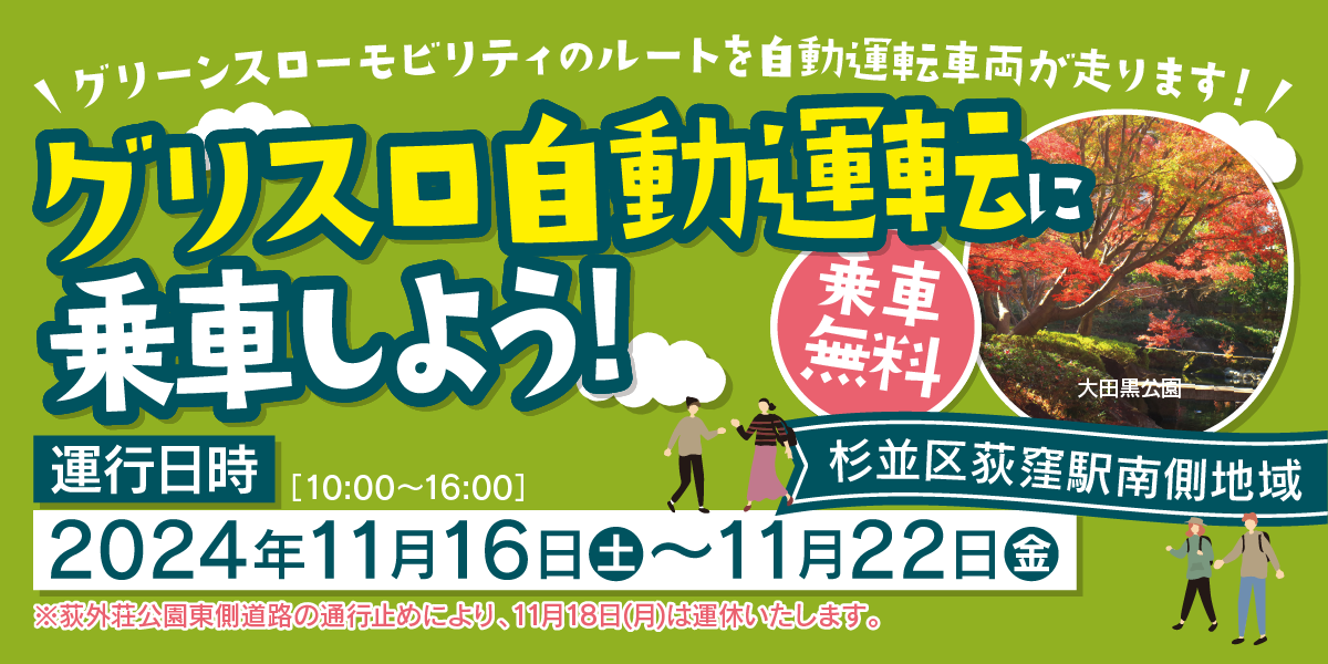 도쿄도는 자율 주행 기술을 활용한 도시 조성을 추진하고 있습니다. 이번에 도쿄 내 3개 지역(스기나미구 오기쿠보역(杉並区荻窪駅), 다마시 다마 센터역(多摩市多摩センター駅), 미즈호마치 하코네가사키역(瑞穂町箱根ケ崎駅) 주변)에서 11월부터 순차적으로 레벨 2(운전자가 탑승하는 방식) 의 자율 주행 버스를 운행합니다. 탑승 고객을 대상으로 설문조사를 실시하오니, 많은 협조 부탁드립니다. 본 운행의 운영은 일본공영 주식회사에 위탁하여 진행됩니다.