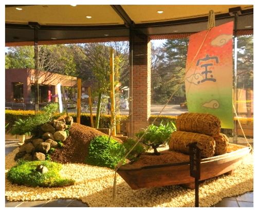 봄의 7초(七草), 송죽매(松竹梅), 천냥(千両), 만냥(万両) 등 정월 분위기의 식물을 전시합니다. 진대사초등학교 학생들이 공원에서 사생한 그림도 함께 전시됩니다.