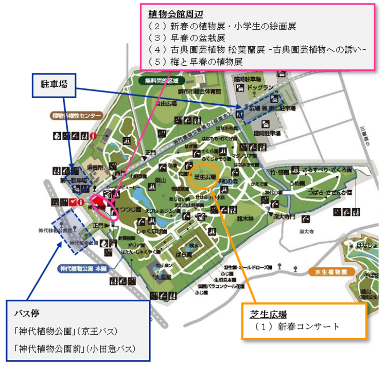 진대(神代)식물공원은 새해 1월 2일(금)부터 개원하며, 신춘 콘서트와 겨울모란 등 새해 분위기를 느낄 수 있는 식물 전시로 여러분을 맞이합니다. 철쭉원 연못에서는 겨울철 풍물시인 ‘눈덮개(설승, 雪吊り)’도 감상하실 수 있습니다. 진대식물공원에서 밝은 새해의 한때를 보내시기 바랍니다.